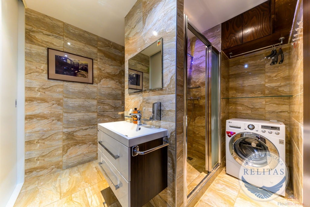 Interiér je udržovaný, funkčně vybavený a myslí i na bezpečnost a pohodlí. Vstup do bytu chrání bezpečnostní dveře. Kuchyňský kout disponuje veškerými potřebnými spotřebiči a plynule navazuje na obývací pokoj, odkud se naopak naskýtají dechberoucí výhledy na západy slunce. Koupelna je vybavena sprchovým koutem s nízkým prahem a sedátkem, což zajišťuje komfortní přístup i pro osoby s omezenou pohyblivostí.