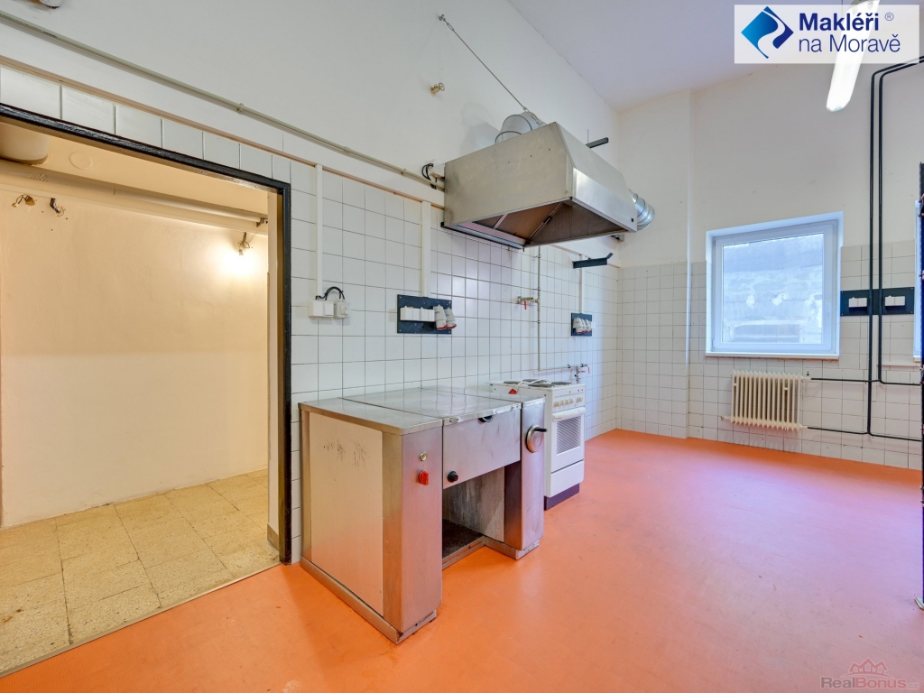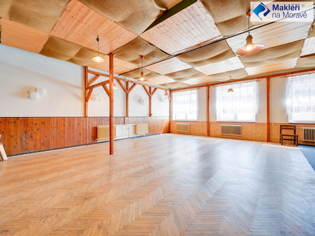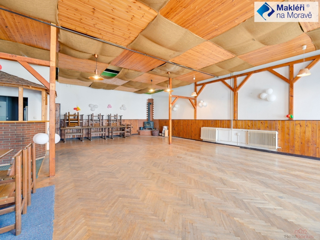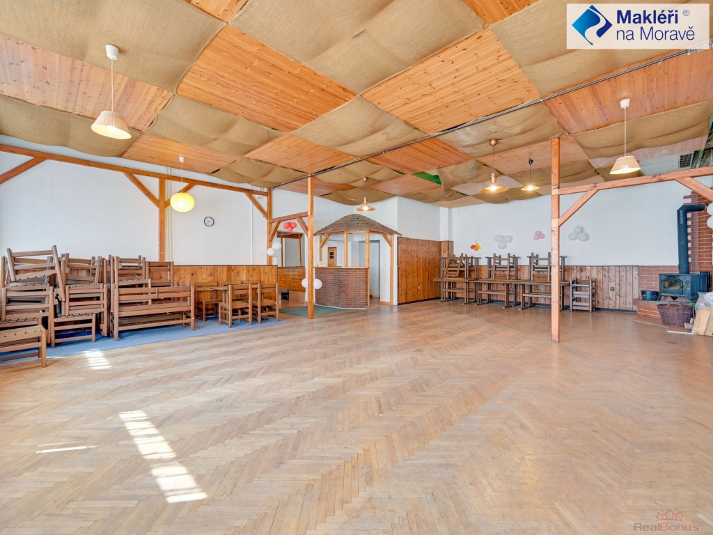 1. NP - v pravé části objektu je situovaný velký sál s výčepem (dnes již nefunkční). V zadní části objektu se nachází bývalá kuchyň a sklady. Sál s výčepem, kuchyní a sklady by mohl v budoucnu umožnit restaurační provoz. V přední části jsou situované 2 apartmány (1+kk) se soc. příslušenstvím (koupelna se sprchovým koutem a WC). Vstup do sálu je možný i z přední části budovy přes malou chodbičku. Vedle předních vchodových dveří je po levé straně umístěno nadkryté venkovní posezení. Hlavní vstup do bytové části s komunikačními prostory (schodiště) se nachází v zadní části objektu, kde jsou rovněž venkovní parkovací místa.