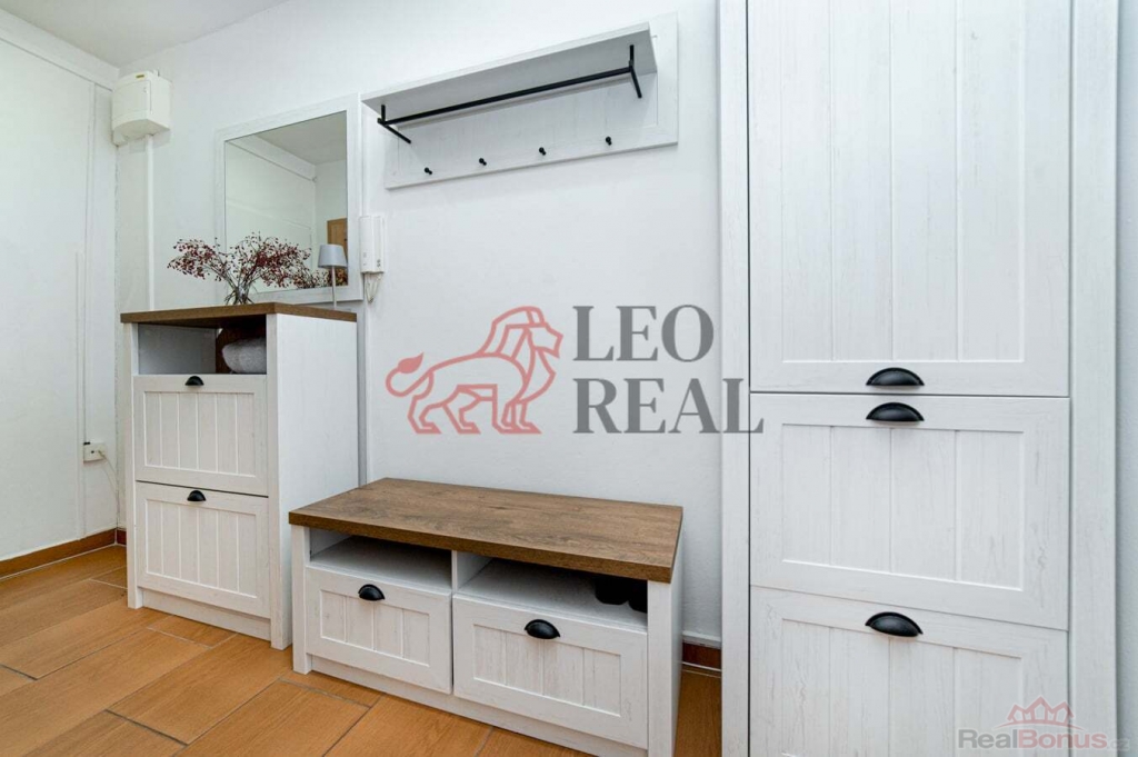 Téměř všechen nábytek z fotografii zůstává k dispozici a to : kompletní vybavení předsíně, v kuchyni zůstává jídelní stůl + židle, ložnice - postel, noční stolky, komoda, skříň, obývací pokoj - sedačka, konferenční stůl, závěsná prosklená skřínka, skřínky pod TV, černý regál u okna, černý regálek u radiátoru.