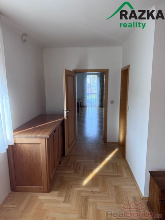 Přízemí prostorný obývací pokoj se vstupem na terasu, kuchyň se spíží, ložnice s vlastní koupelnou, samostatné WC a přístavba s rohovým vnitřním bazénem a druhou terasou.