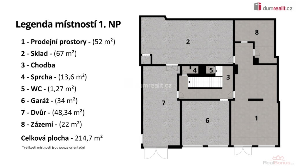 1.podlaží na ploše cca 214 m, kde je nyní prodejní prostor, kancelář s kuchyňským zázemím, skladovací prostory a další skladovací prostory v nynějším garážovém prostoru a samostatné sociální zázemí