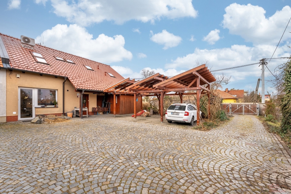 Velká zahrada a parkování ? zahrada o rozloze 651 m2, v přední části domu je kryté parkování pro více aut, kde je možné umístit třeba i karavan.