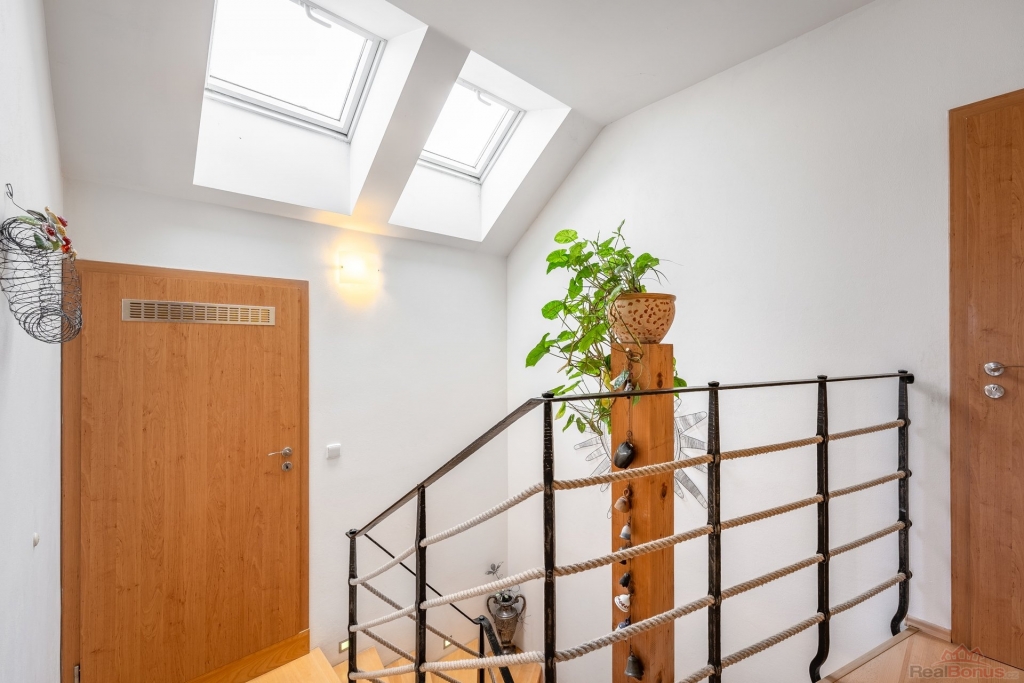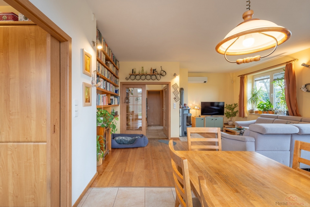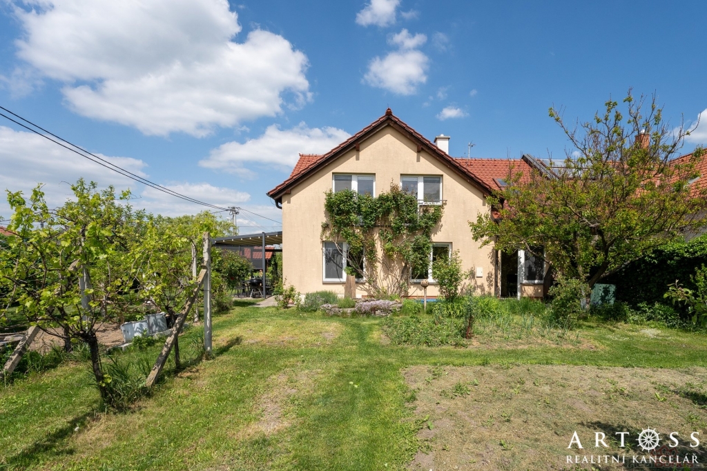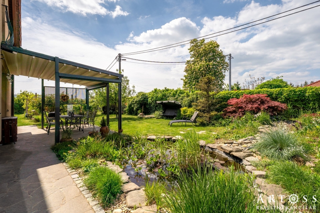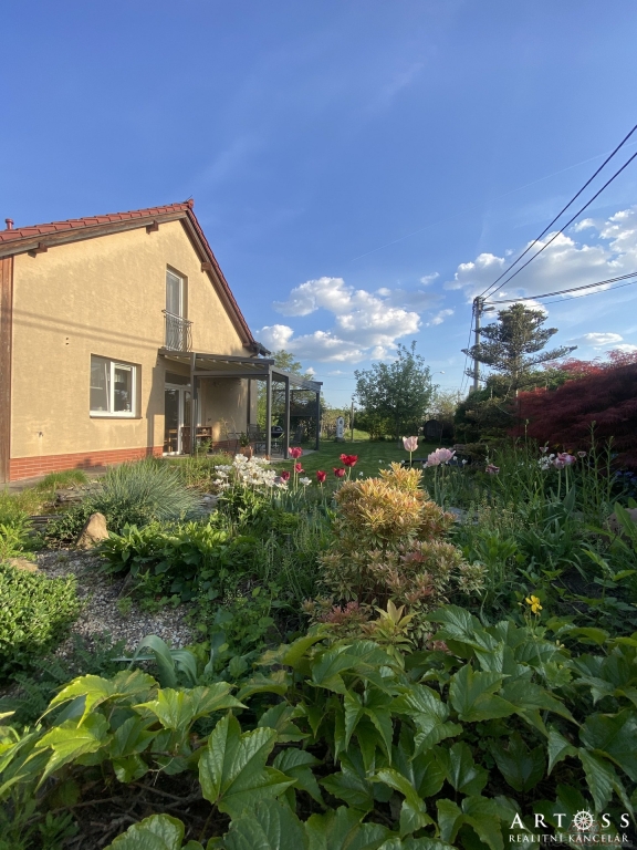 Velkorysý prostor, obytná část domu je orientována na jih, což zajišťuje dostatek denního světla. Jižním směrem je orientována i krásná zahrada s přírodním jezírkem, ovocnými stromy a vinnou révou. Je zde dostatek prostoru pro vybudování bazénu i hrací části pro děti. Ideální místo pro rodinu s dětmi.