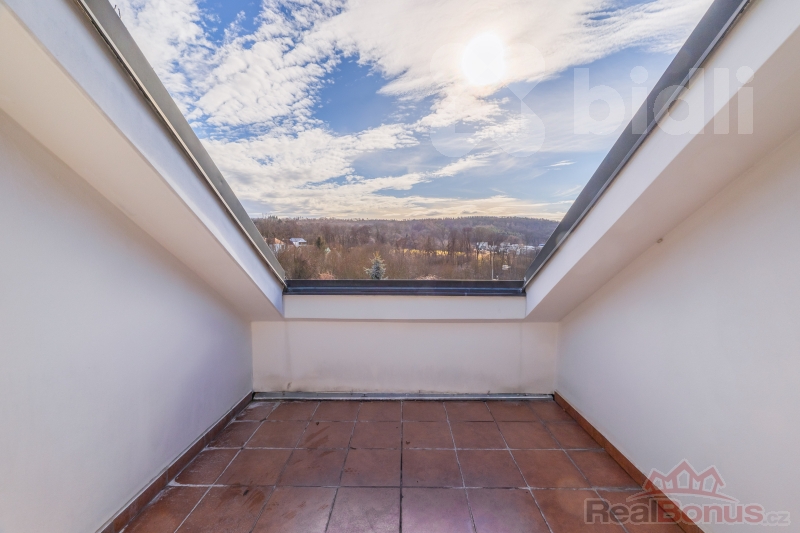50m hlavní terasy představuje relax s výhledem na protější břeh vltavského břehu, ale výhled z balkónu a malé terásky ve vyšších podlažích Vám vezme dech.