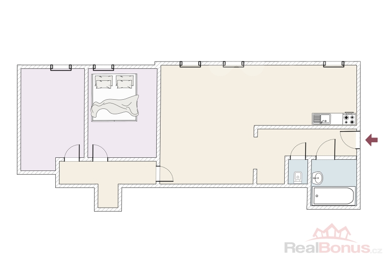 Byt se skládá ze vstupní chodby, koupelny s vanou, samostatného wc, praktické komory, prostorného obývacího pokoje propojeného s kuchyňským koutem, dvou neprůchozích pokojů (ložnic) a bezpečnostních dveří.