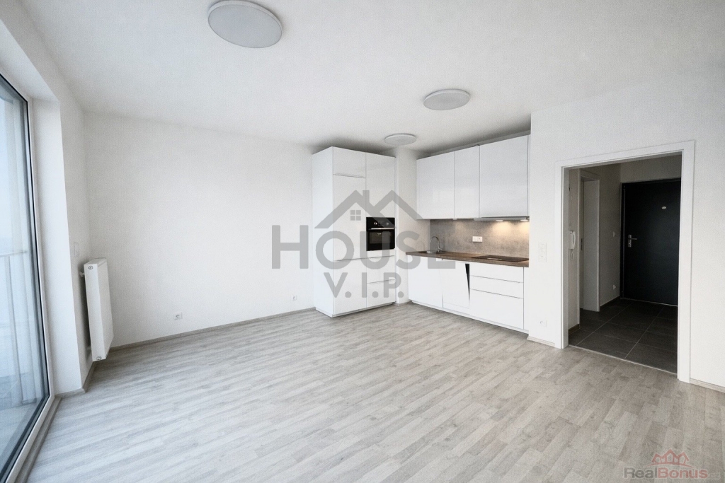 Dispoziční řešení bytu zahrnuje vstupní předsíň s vestavěnou skříní, obytný pokoj s moderním kuchyňským koutem (lednice, trouba, indukční varná deska, myčka nádobí, digestoř) a přímým vstupem na balkon, dále koupelnu se sprchovým koutem, pračkou a toaletou. Podlahové krytiny tvoří kvalitní vinyl a dlažba. Plastová okna jsou vybavena venkovními žaluziemi. Orientace bytu je na západ.