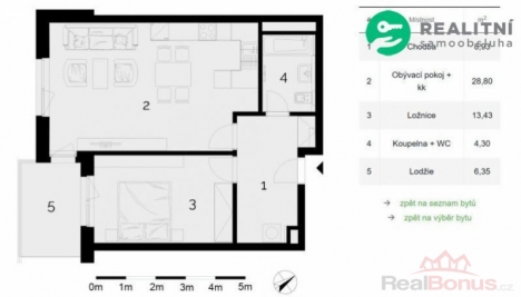 Byt se nachází v pětipodlažním, plně bezbariérovém bytovém domě s energetickým štítkem třídy B, který zajišťuje úsporný provoz. Samotný byt o užitné ploše 55,46 m je situován ve 3. nadzemním podlaží a je orientován na jihozápadní stranu, díky čemuž je velmi světlý a příjemný. K bytu náleží také komora o velikosti 3,7 m a lodžie o ploše 6,35 m.