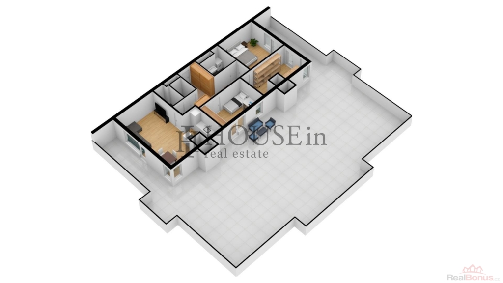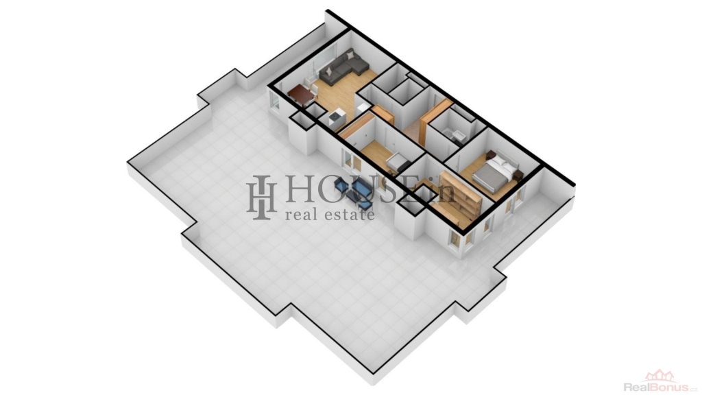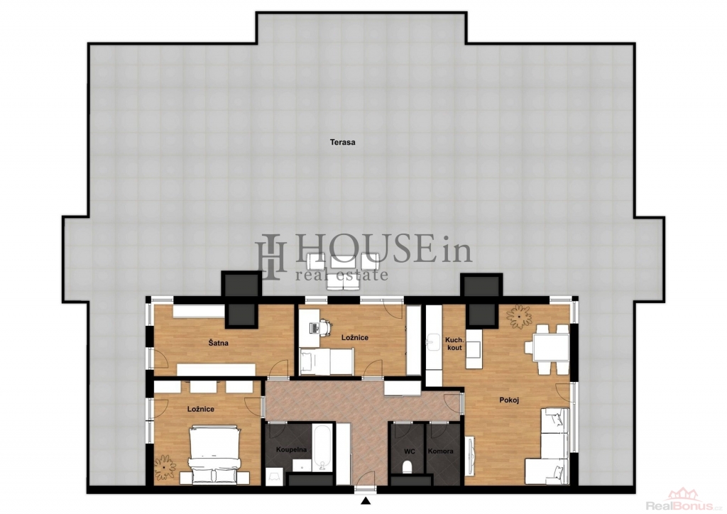 Dispozici tvoří prostorná předsíň, ze které jsou samostatné vstupy do všech místností. Obývací pokoj s kuchyňským koutem, ložnice, dětský pokoj, velká šatna, koupelna s vanou, samostatná toaleta a komora. Velkou předností bytu je terasa, která obklopuje celý byt a je přístupná ze všech obytných místností. Nabízí dostatek prostoru pro posezení i relaxaci.