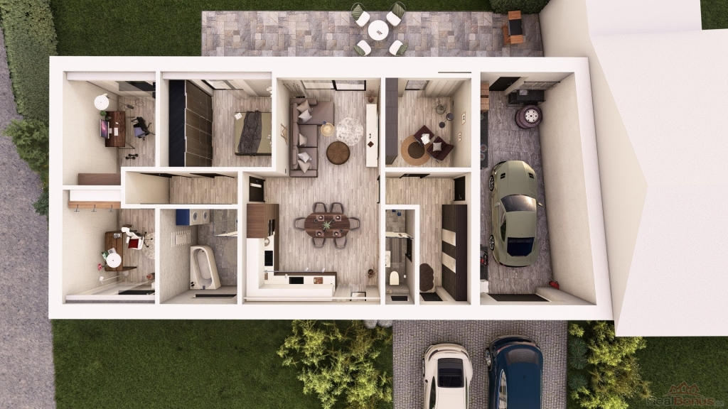 garáž s vraty na dálkové ovládání 27,48 m2 s umyvadlem/výlevkou a přípravou na pračku a sušičku, předsíň 8,93 m2, 1. koupelna s WC, umyvadlem a sprchovým koutem 3,20 m2, pracovna/šatna 9,19 m2, obývací pokoj s kuchyňským koutem 32,32 m2, chodba 4,13 m2, ložnice 11,96 m2, pokoj 10,96 m2, pokoj 10,96 m2, 2. koupelna s WC, vanou, sprchovým koutem a dvojumyvadlem 8,35 m2.