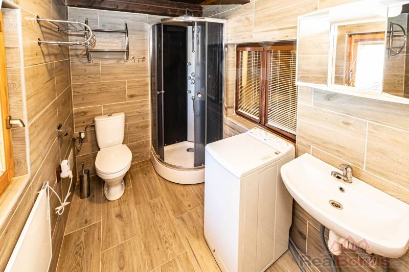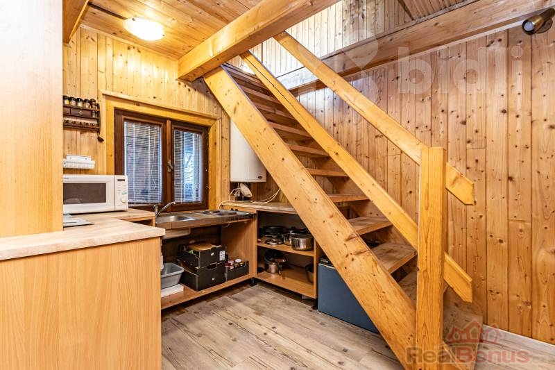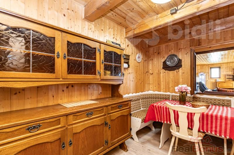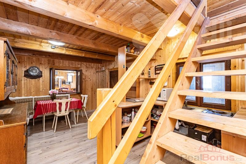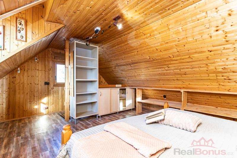 Interiér srubu tvoří útulný obývací pokoj, ložnice a kuchyňský kout. Koupelna je vybavena sprchovým koutem, toaletou a bojlerem pro ohřev vody. Pro tepelný komfort v chladnějších měsících jsou v celém objektu osazena plastová okna. Vytápění spolehlivě zajišťují kamna na dřevo, která srubu dodávají tu správnou atmosféru, doplněná o elektrické přímotopy. Srub je ve velmi dobrém technickém stavu, zastřešen sedlovou střechou s pálenou taškou a připraven k okamžitému užívání. Technické napojení zahrnuje obecní vodovod, elektřinu a vlastní čističku odpadních vod.