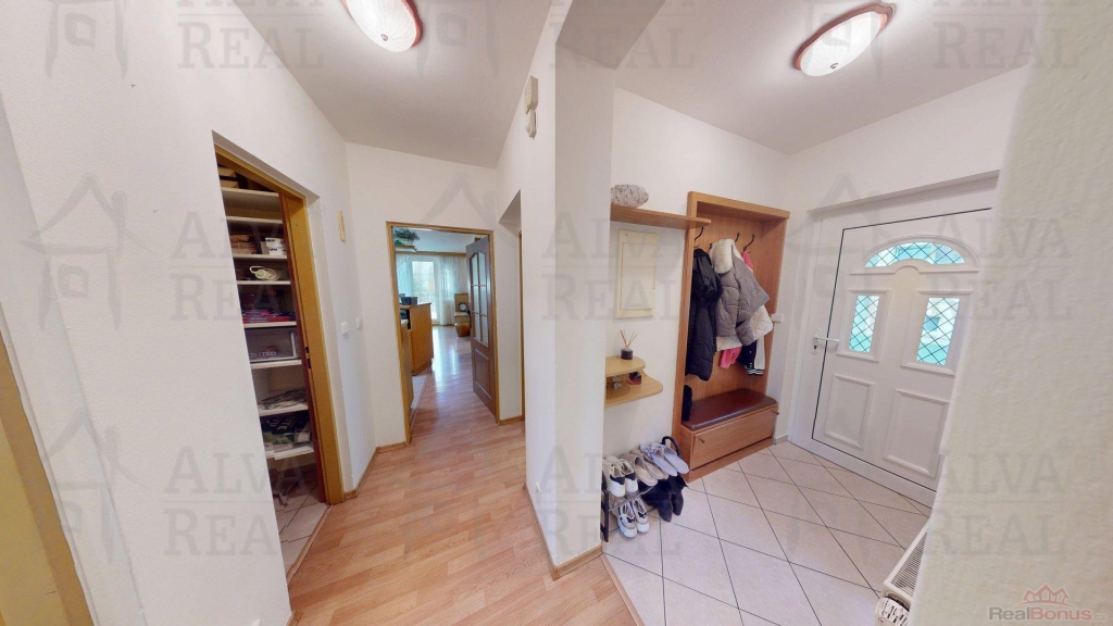 Dispozice: Obývací pokoj 14,2 m?; ložnice 9,4 m?; pokoj 10,8 m?; kuchyně 8,7 m?; koupelna 6,5 m?; WC 2 m?; chodba 3,2 m?; předsíň 3,2 m?; spíž 2,7 m?; terasa 12 m?.