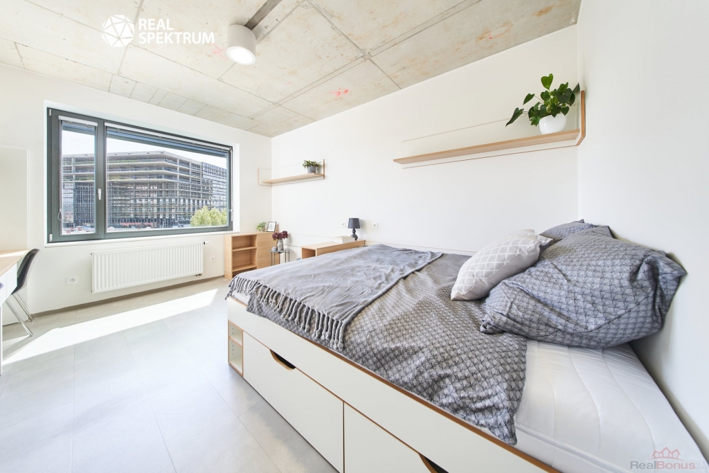 Byt je vybaven a připraven k nastěhování. Najdete zde kuchyňskou linku (varná deska, lednice, mikrovlnka), manželskou postel, pracovní stoly pro studium či home office a šatní skříně. Koupelna disponuje sprchovým koutem, umyvadlem a toaletou.