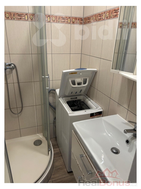 Koupelna: Sprchový kout a pračka.