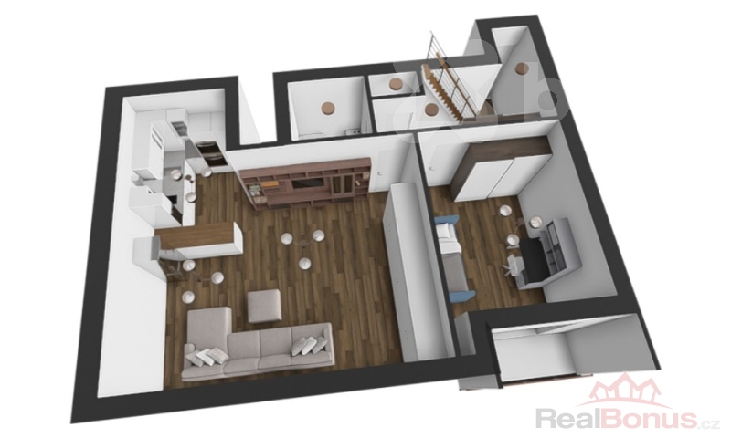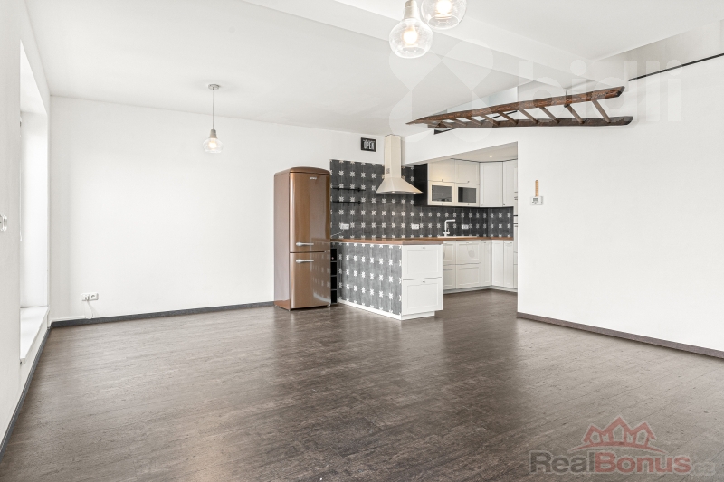 Srdcem bytu je ale velkorysý obývák s kuchyňským koutem. Prostor, kde se vaří, žije, směje, hostí. A nad tím všechno přichází "to navíc": galerie se dvěma střešními okny. Ideální na pracovnu, relax zónu, knihovnu nebo prostě místo, kam si večer zalezete s vínem a vypnete.