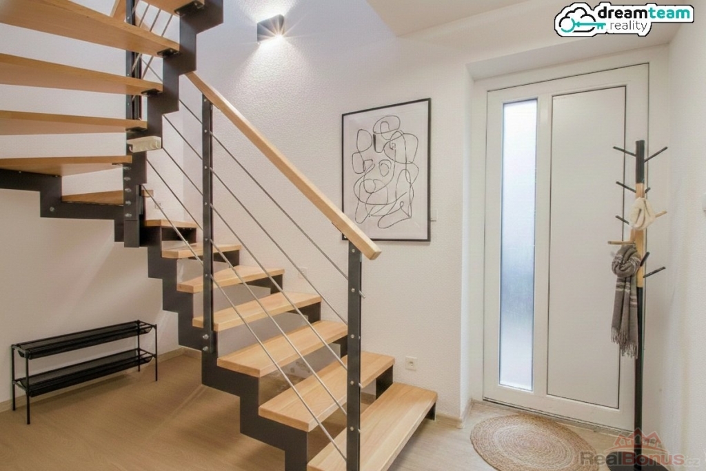 Moderní prostor s klimatizací. Byt má osmdesát jeden metrů čtverečních a je navržený prakticky ? dvě neprůchozí ložnice v přízemí, o patro výš prostorná koupelna a otevřený prostor kuchyně s obývacím pokojem. Obývák má okna na východ, kuchyně na západ ? takže ráno vás budí sluníčko v obýváku a večer si užíváte západ slunce při vaření. A když vám v létě bude horko, máte klimatizaci ? podrobnosti ohledně nákladů probereme na prohlídce. Kuchyně je vybavená troubou a varnou deskou, případně lze dodat i lednici nebo myčku ? všechno je na dohodě.