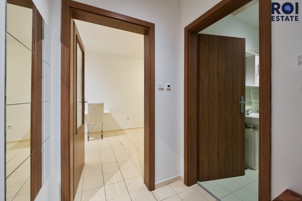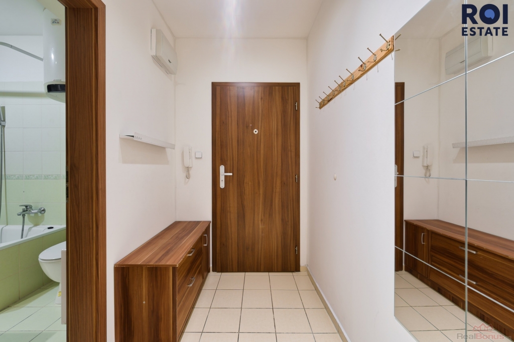 Koupelna je překvapivě prostorná, s oknem, které dodává místnosti vzdušnost. Je zde vana, toaleta, umyvadlo, elektrický bojler a příprava na pračku ? vše prakticky na jednom místě. Vstupní chodba působí příjemně hned po příchodu domů, díky botníku a velkému zrcadlu.