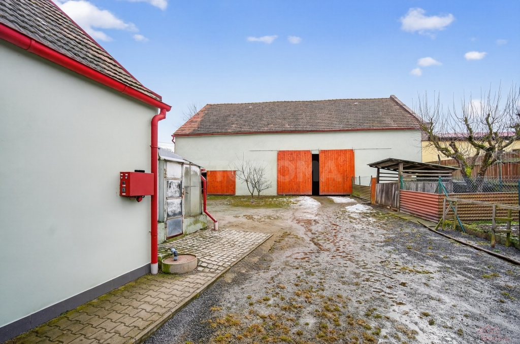 Hospodářská část: Velká stodola v dobrém stavu a manipulační plocha s vlastním vjezdem z ulice pro nákladní vozidla ? ideální pro podnikatele (sklad, autodílna, zemědělství).