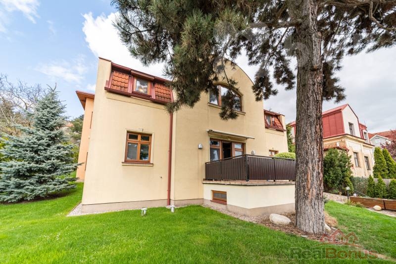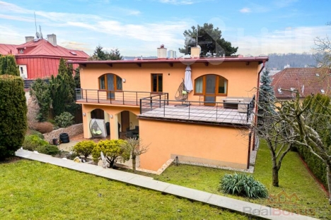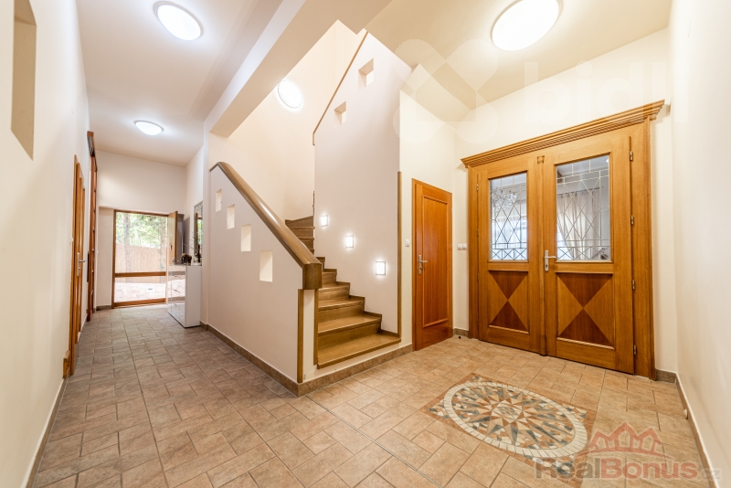 Tato reprezentativní vila stojí na slunném pozemku orientovaném na jihovýchod a nabízí vynikající prostorové uspořádání pro rodinný život i společenské události. V přízemí domu se nachází prostorný světle prosvětlený obývací pokoj s krbem, který plynule navazuje na kuchyň s kvalitní dřevěnou linkou a jídelním prostorem. Velkorysý vstupní prostor vytváří pocit otevřenosti a elegance.