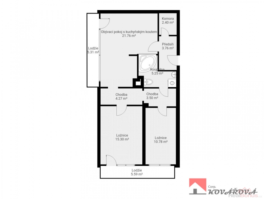 Jedná se o velmi světlý a vzdušný byt, který se nachází ve 12. patře panelového domu se dvěma výtahy. Dispozice bytu nabízí kuchyň propojenou s obývacím pokojem se vstupem na lodžii, dva samostatné pokoje (z jednoho je vstup na druhou lodžii), koupelnu s vanou a WC, komoru a vstupní chodbu.