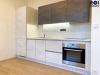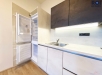 Byt je vybaven kuchyní na zakázku, včetně lednice, myčky nádobí, trouby, varné desky a digestoře. Povšimněte si vinylových podlah v dekoru dřeva.