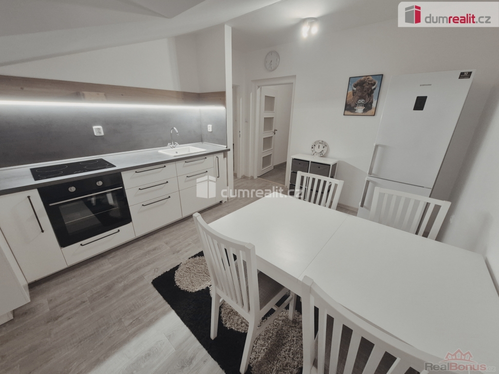 Je zde velmi prostorná nová kuchyňská linka a nově moderně zrekonstruovaná koupelna s oddělenou toaletou a celý byt je laděn do šedo-bílého tónu.