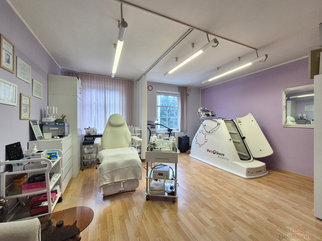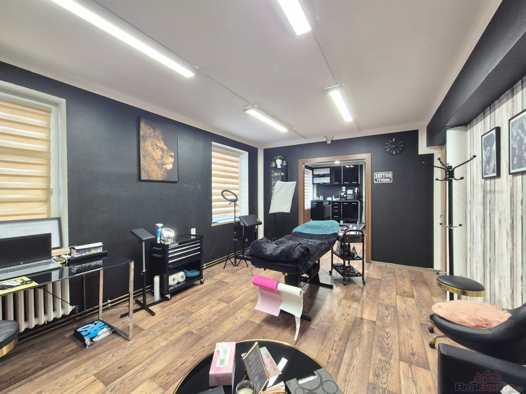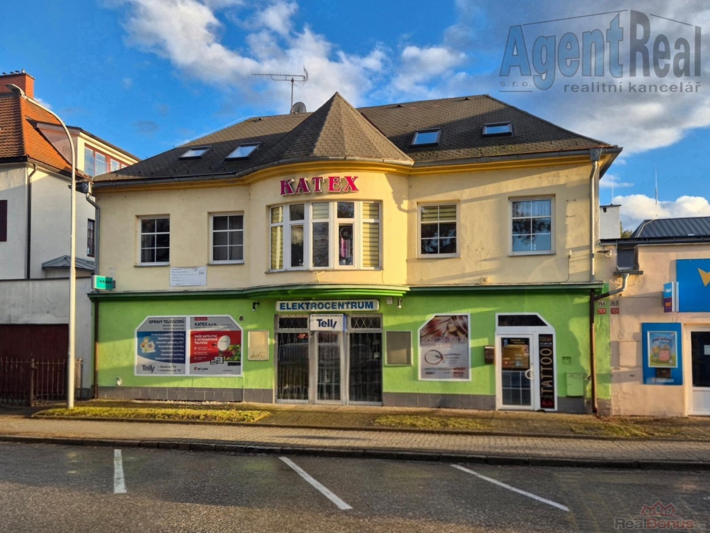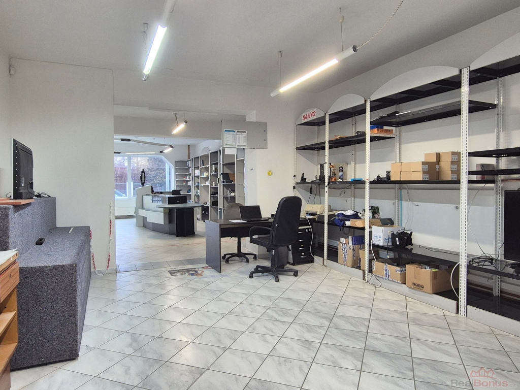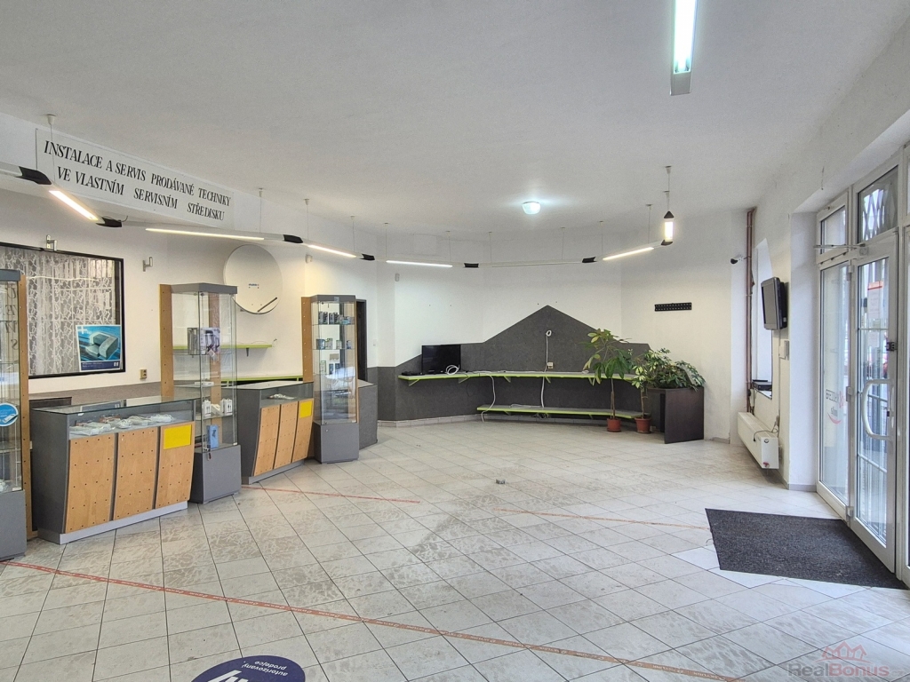Nabízíme prodej komerčního areálu v centru Šumperka. Jedná se o bývalou prodejnu a servis firmy KATEX. Hlavní budova byla přestavěna do dnešní podoby v roce 2000. V přízemí se nachází hlavní prodejní prostor, který lze rozšířit místo stávající kanceláře a skladu na 92.2 m2. Na hlavní prostor navazuje otevřená místnost 38.7 m2 a lze získat celkovou prodejní plochu cca 131 m2. V zadní části jsou dva sklady, menší kancelář a kout s malou kuchyňskou linkou (celkem 85 m2) a zcela novým plynovým kotlem, který zajišťuje vytápění pro všechny komerční prostory .