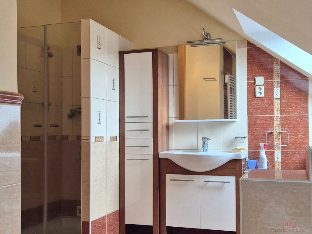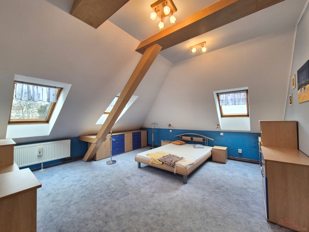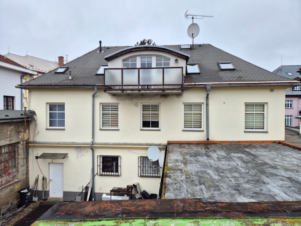 V 1. patře se nachází tři pronajaté provozovny (26,6 m2, 27.1 m2 a 37.4 m2), chodba a společné WC. V podkroví se nachází apartmánový byt 3+kk s terasou (celkem 125 m2), který je částečně vybavený nábytkem, myčkou, pračkou, má samostatné plynové topení s ohřevem teplé vody a samostatné měření elektřiny a vody.