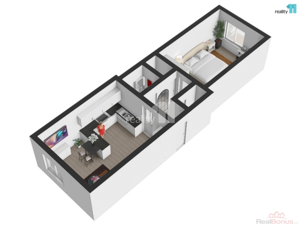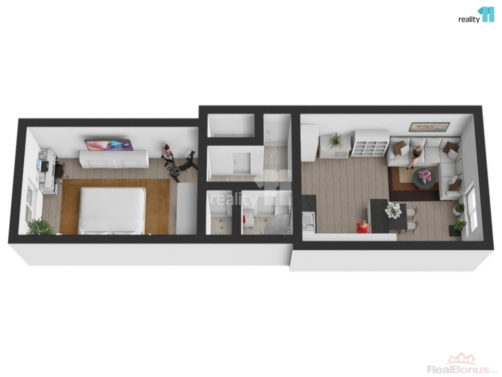 - praktické zázemí: Koupelna se sprchovým koutem, pračkou i sušičkou a nepostradatelná komora přímo v bytě.
