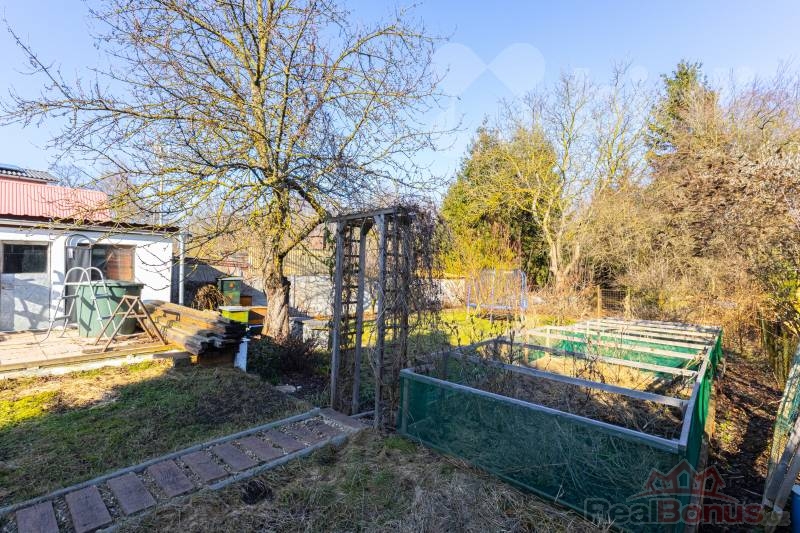 Zahrada je osázena ovocnými stromy a nabízí příjemné soukromí i prostor pro relaxaci, rodinné posezení nebo zahradničení.