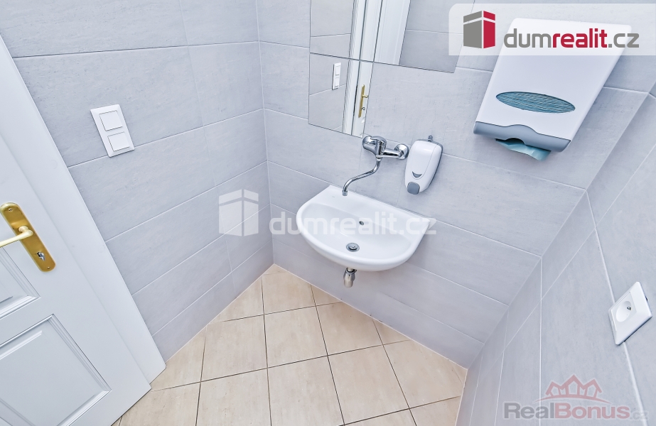 Před kancelářemi je společná chodba, kde se nachází pánské a dámské WC a společná kuchyňka, výtah a schodiště.