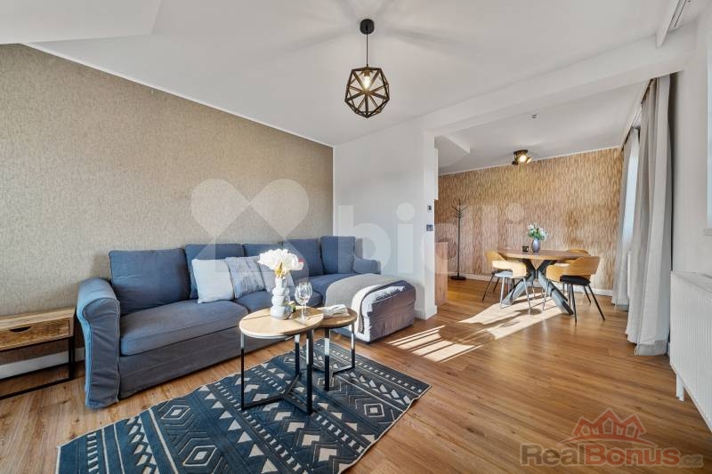 Prodává se včetně zařízení (Kuchyňská linka s vestavěnými spotřebiči, jídelní stůl, židle, rozkládací sedací souprava, konferenční stolek, manželská postel).