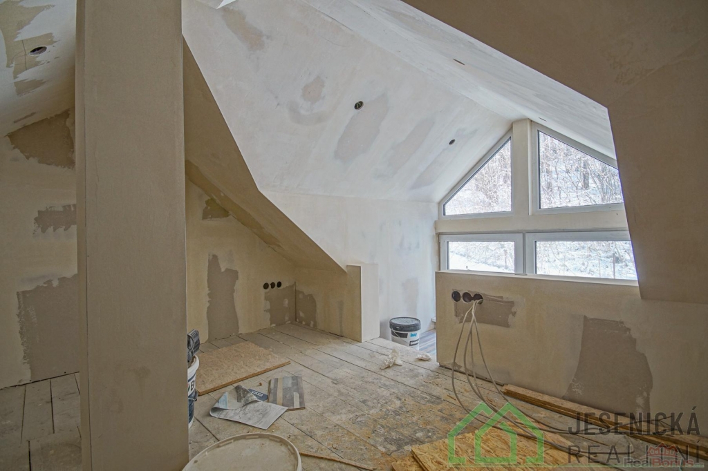 Ve druhém podlaží jsou čtyři pokoje, které jsou momentálně v rekonstrukci. V hřebeni půdního prostoru se nachází další místnost vhodná k přespání, rovněž v započaté rekonstrukci. Dům tak nabízí možnost úprav dle vlastních představ.