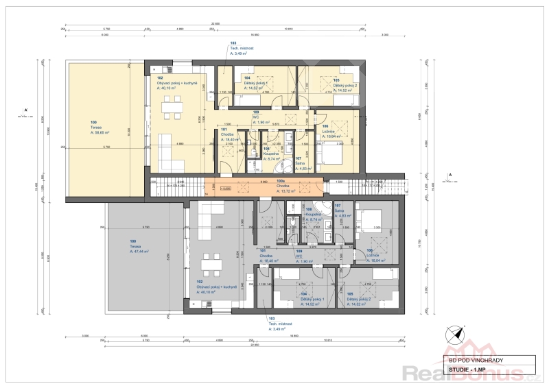 Každý byt má 117m2, větší terasu s nádherným výhledem 47m2 a 59m2, vlastní garáž 32m2 a zahradu. Před domem je plánováno šest parkovacích stání.