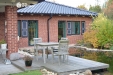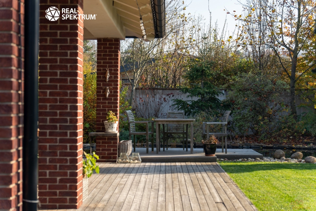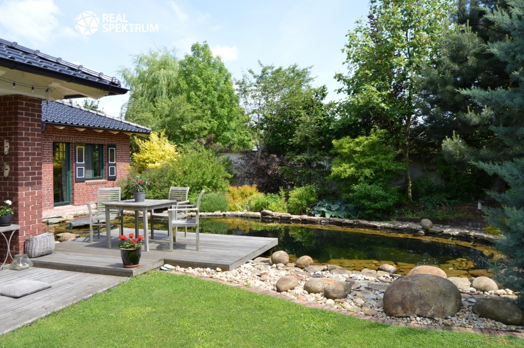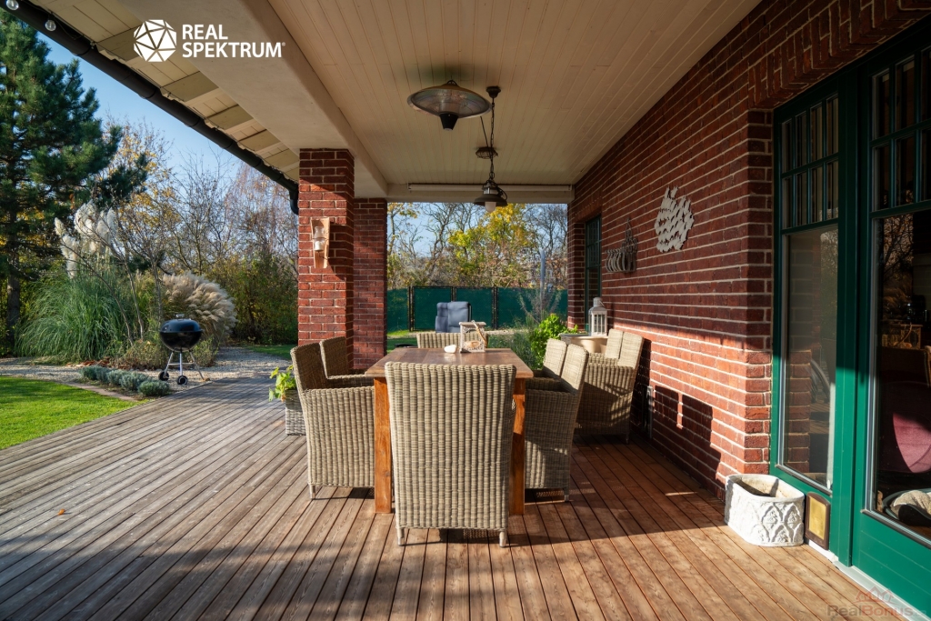 Exteriér domu nabízí ke zpestření života koupací jezírko (25 m3) s dřevěným molem s adekvátní technologií zajišťující čistou vodu po celý rok, dále venkovní ohniště, vinný sklípek či sportovní hřiště s umělým povrchem. Dům disponuje velkou útulnou zastřešenou terasou (zastřešená část 31,2 m2; s nezastřešenou částí celkem 50 m2).