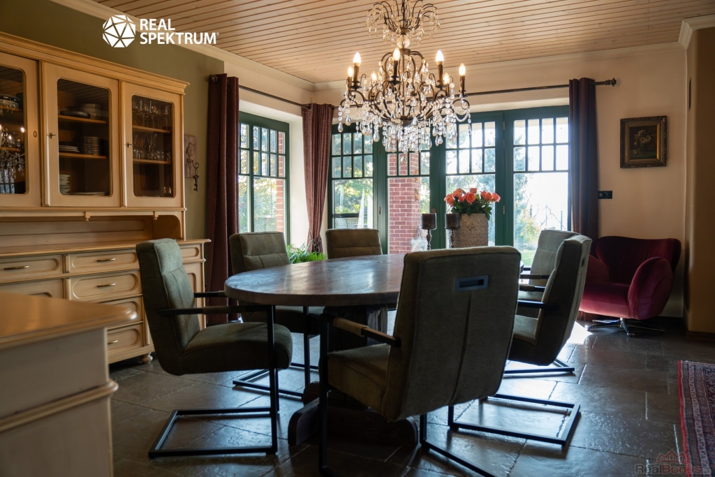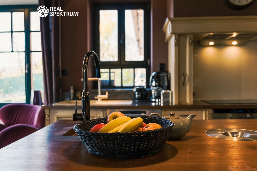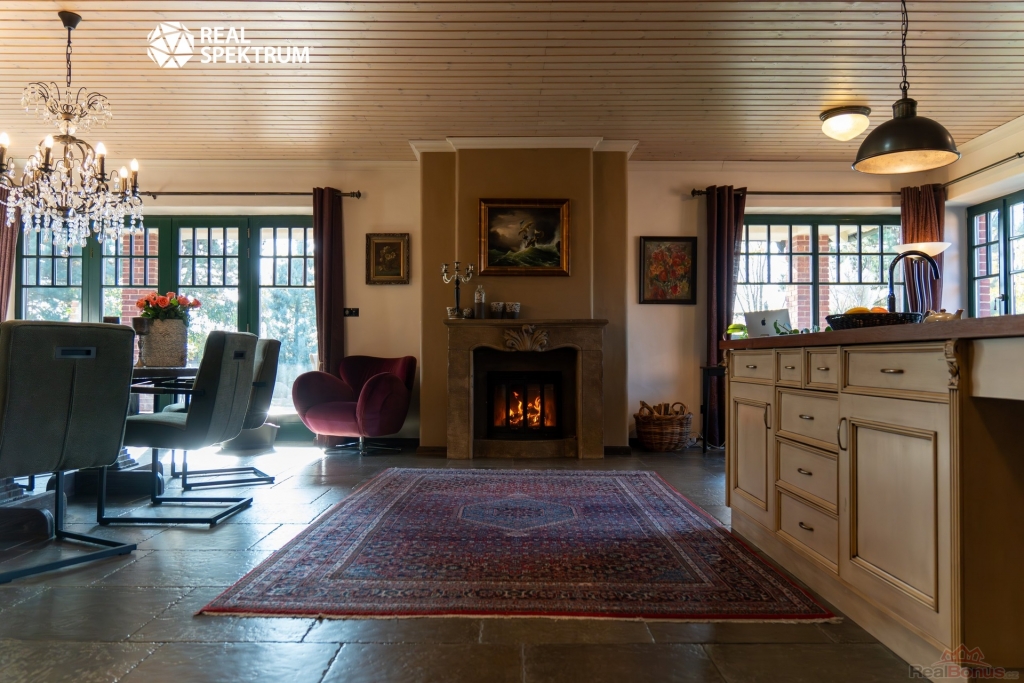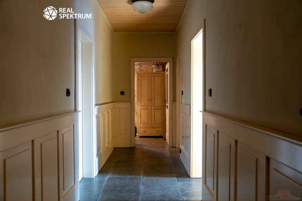 Interiér je laděn do tmavších tónů v kombinaci industriálního a rustikálního stylu, což jej tvoří jednak moderním a jednak útulným místem k životu. Stran designu interiéru jsou stropy v celém domě jsou řešeny bezúdržbovými dřevěnými lamelami (palubkami) ve světlém odstínu lazury. Rodinný dům je vybaven dvěma toaletami, jedním bidetem a dvěma koupelnami. V domě je i připravený prostor na vnitřní saunu včetně dostatečné elektro kapacity pro ty, kteří by si chtěli život v této skvostné nemovitosti ještě více zpříjemnit. Hlavní obytné místnosti dominuje velký krb s krbovou vložkou, což dodává místu doslova teplo domova.