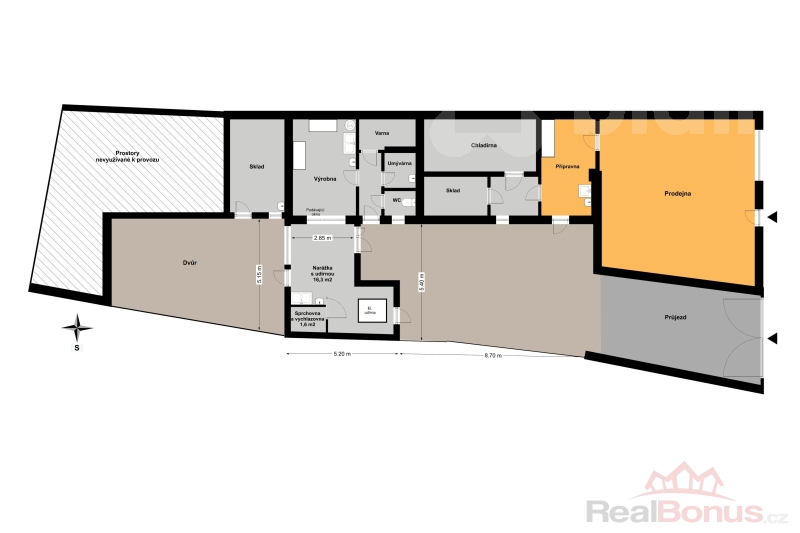 Při vstupu do objektu vás přivítá prostor bývalé prodejny, na který navazuje výrobna a skladové prostory. V roce 2003 byla vybudována spojovací chodba, která přidává další praktické prostory na dvorku. Za nemovitostí se nachází prostorná stodola. Nemovitost nabízí také možnost rozšíření o půdní vestavbu při rekonstrukci.