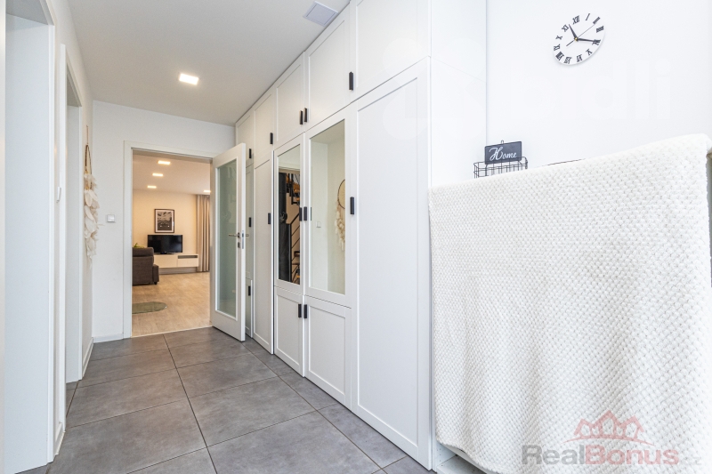 V přízemí domu se nachází vstupní chodba, technická místnost, samostatná toaleta, velkorysý obývací pokoj s kuchyňskou částí o velikosti 56 m2, ložnice, šatna, samostatná koupelna a garáž 25m2. Do patra vystoupáte po schodišti, kde jsou situovány tři samostatné pokoje, další šatna a koupelna. Dispozice domu nabízí dostatek prostoru i úložných možností a je vhodná pro rodinné bydlení.