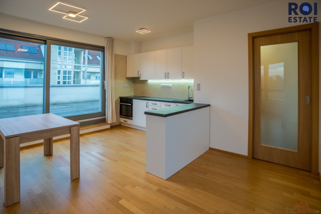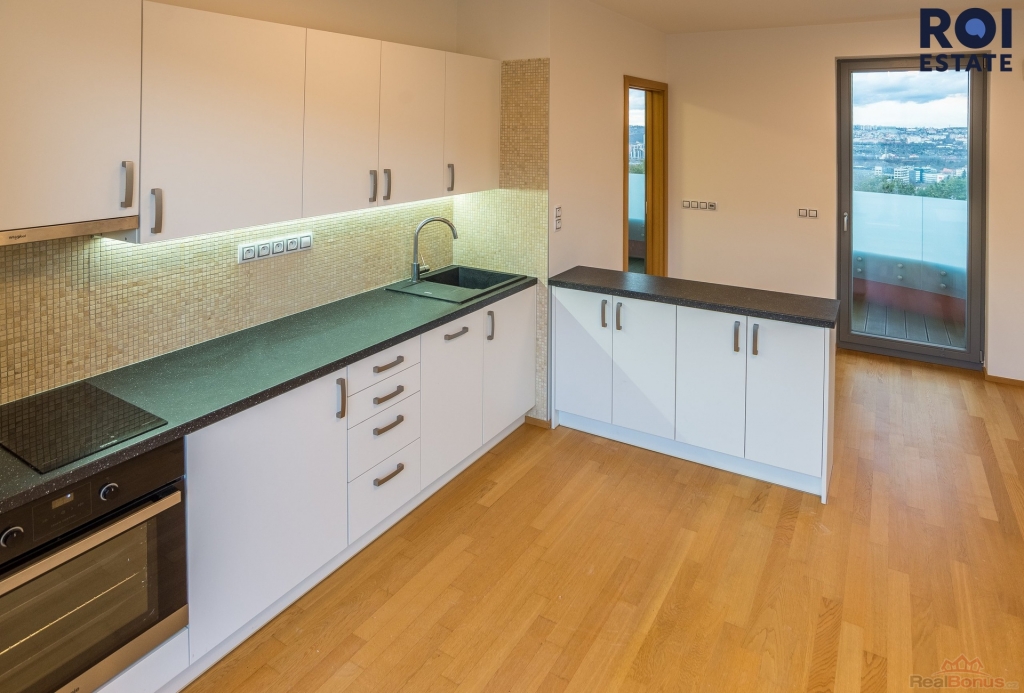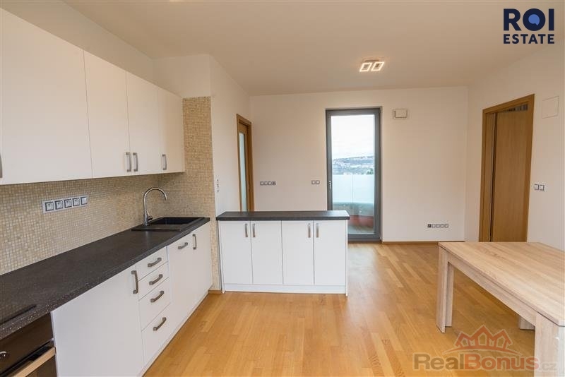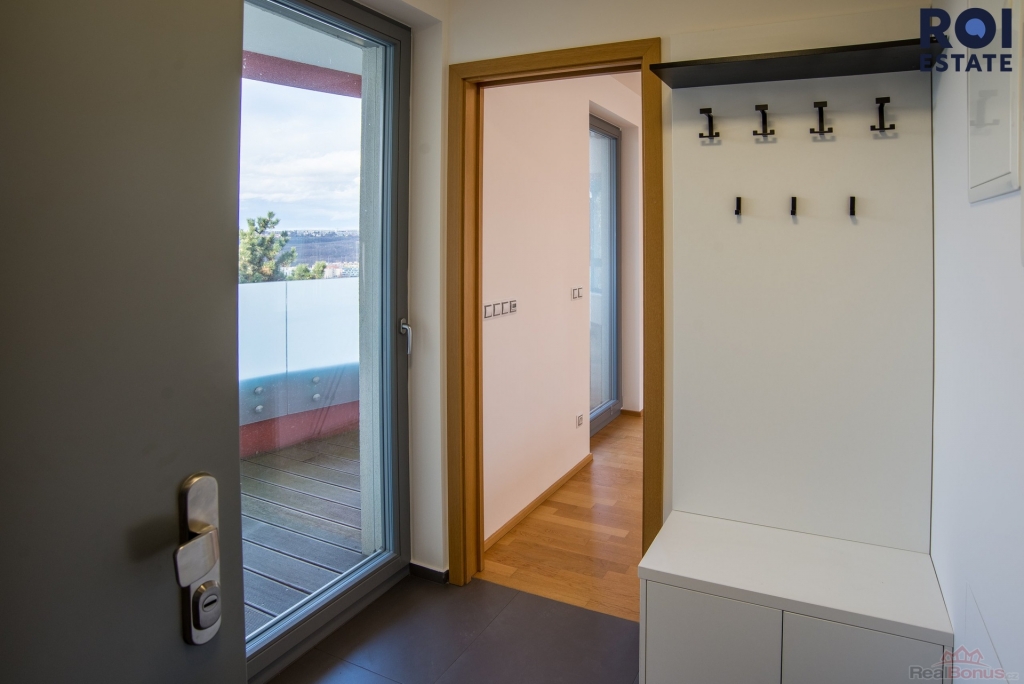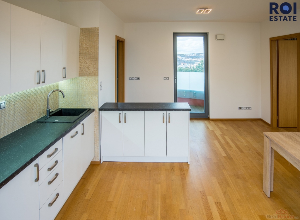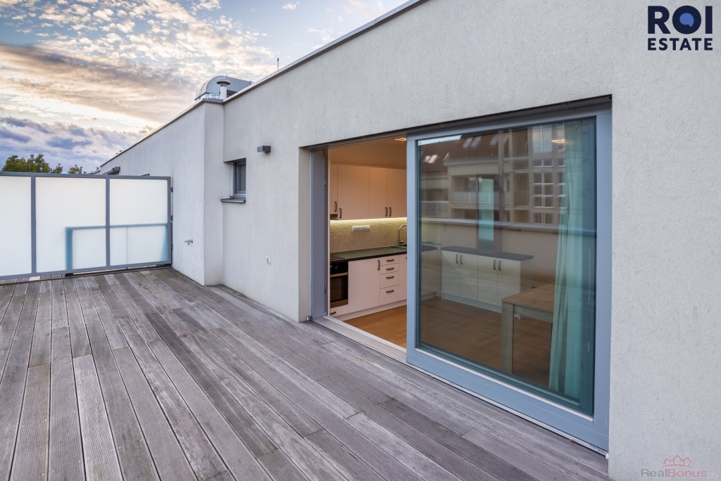 Nabízíme k pronájmu velmi světlý a prakticky řešený byt o dispozici 2+kk a podlahové ploše 49 m2, který zaujme především nadstandardním venkovním prostorem ? terasou o výměře 50 m2 a samostatným balkonem 8 m2. Součástí pronájmu je sklep (4 m2) a garážové stání přímo v budově, což výrazně zvyšuje komfort bydlení.