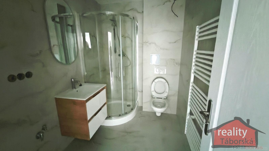 V koupelně je sprchový kout, umyvadlo se skříňkou, osvětlené zrcadlo, topné těleso, toaleta a prostor na pračku s připravenými vývody na vodu a odpad.