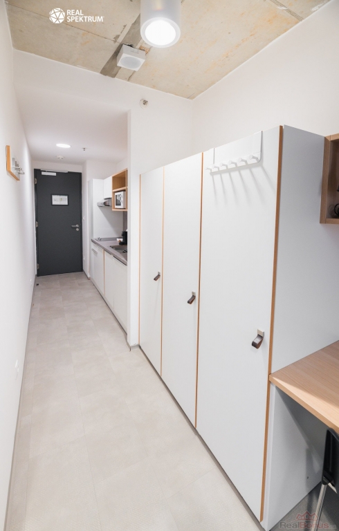 Byt je vybaven a připraven k nastěhování. Najdete zde kuchyňskou linku (varná deska, lednice, myčka, mikrovlnka), manželskou postel, pracovní stoly pro studium či home office, šatní skříně a další úložné prostory. Koupelna disponuje sprchovým koutem a umyvadlem, toaleta je samostatná.