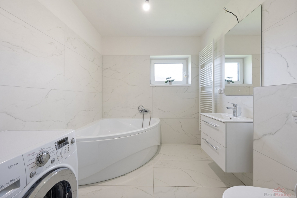 Prostorný a světlý obývací pokoj propojený s kuchyňským koutem, který je kompletně vybaven: indukční varná deska, el. trouba, digestoř, lednice, mrazák a myčka. Z obývacího pokoje je přímý vstup na terasu a do zahrady, což vytváří ideální prostor pro rodinné posezení a relaxaci. Tři prostorné ložnice poskytují dostatek soukromí pro celou rodinu. K dispozici je praktická komora pro uložení věcí. Dvě moderní koupelny ? jedna se sprchovým koutem a WC, druhá s vanou a WC.