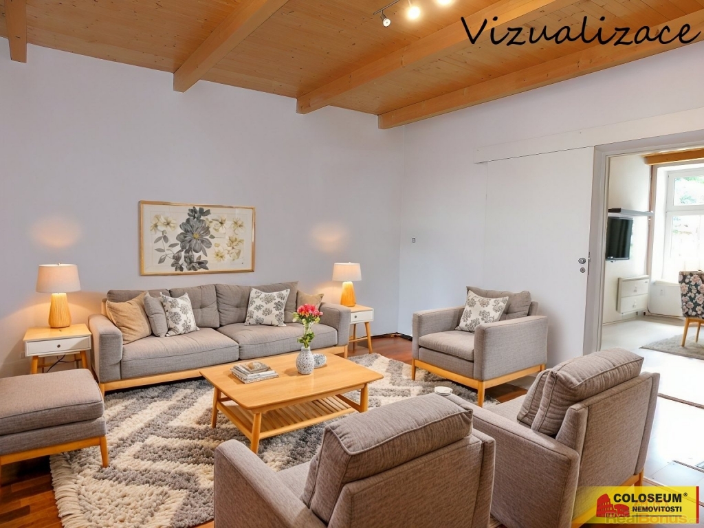 Toaleta je samostatná. Další velkou výhodou tohoto domu je, že má komoru a je podsklepený. Pro lepší představu o možném budoucím stavu jsme přiložili vizualizace interiéru a venkovního posezení. Vytápění domu je řešeno plynovým kotlem nebo krbovými kamny s výměníkem. Ohřev vody zajišťuje plynový kotel.