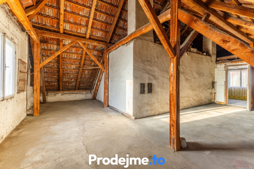V podkroví se aktuálně nachází jeden pokoj a vstup na terasu. Zbytek prostoru tvoří velkorysá půda s výrazným potenciálem pro vybudování dalších obytných místností. Celý dům tak nabízí zázemí pro velkou rodinu i prostor pro hobby či podnikání.