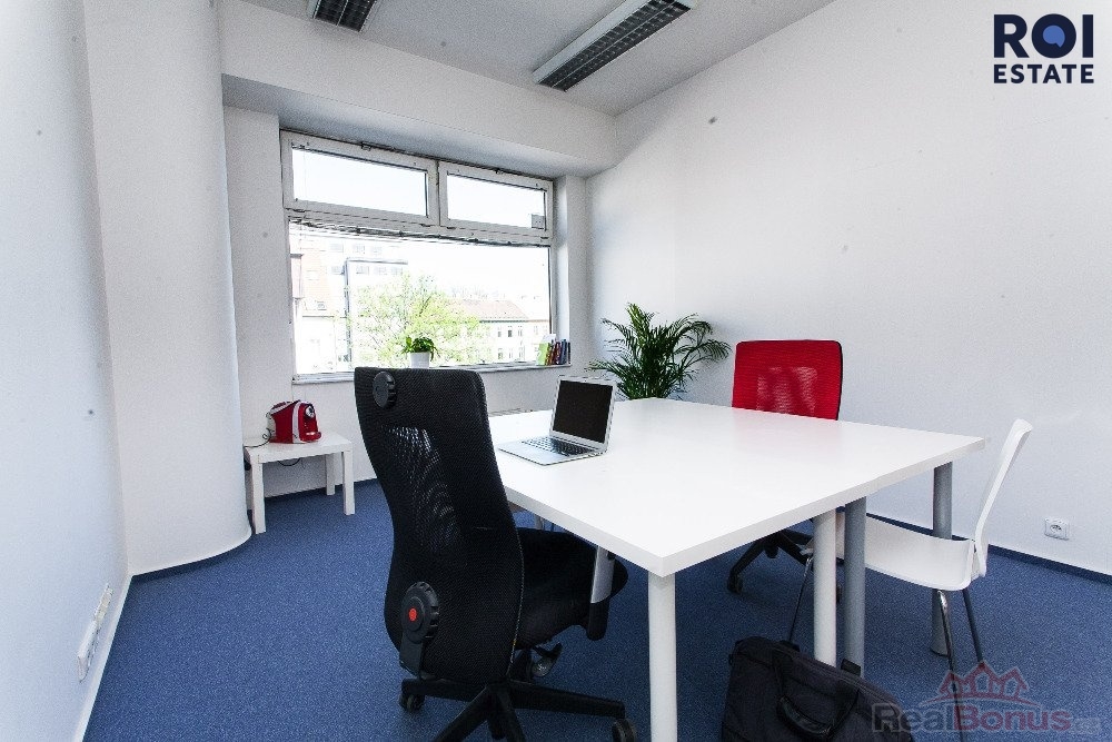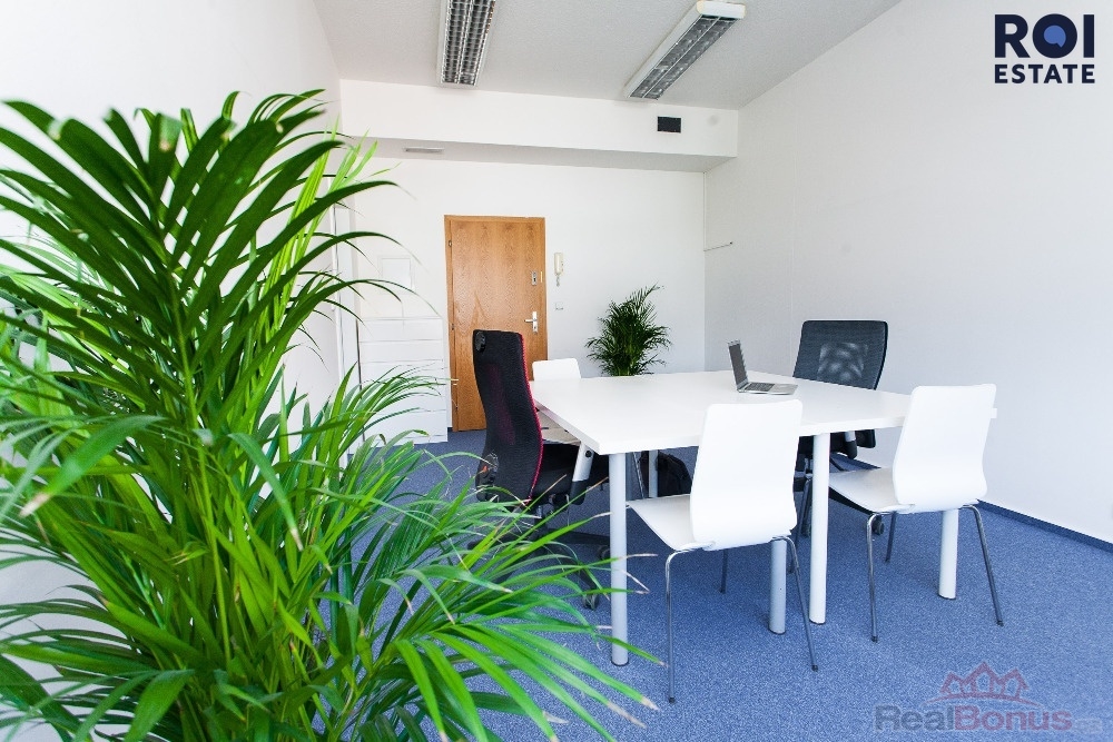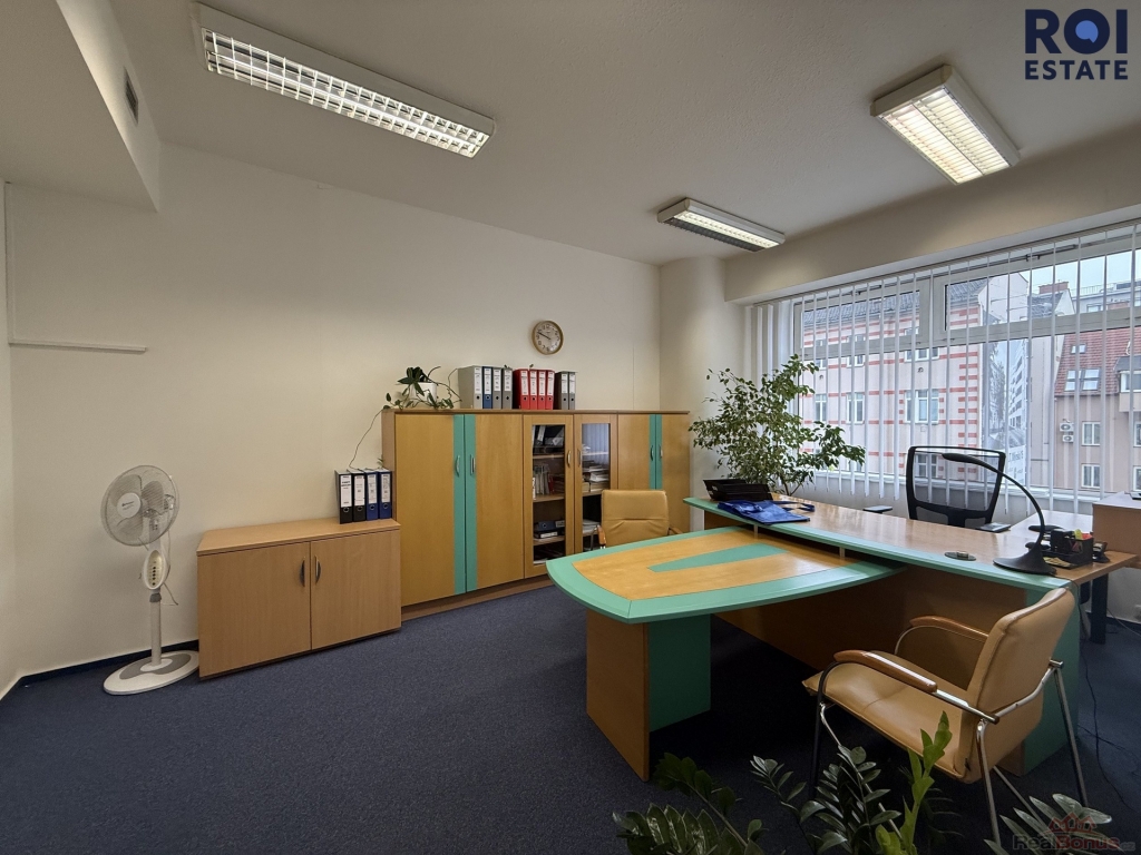 Prostor tvoří dvě samostatné místnosti, které lze využít jako oddělené kanceláře, případně jako pracovní část a jednací místnost. Díky velkým oknům je interiér příjemně prosvětlený, podlahu pokrývají zátěžové koberce, které zajišťují komfort i dobrou akustiku.