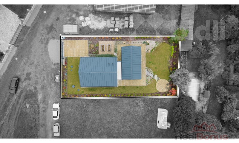 K domu náleží terasa, okrasná zahrada s automatickou závlahou napojená na retenční nádrž a vlastní studnu. K dispozici jsou 2 parkovací stání na pozemku a dobíjecí stanice pro elektromobil. Nemovitost je z inženýrských sítí napojena na obecní vodovod, kanalizaci a elektřinu.
