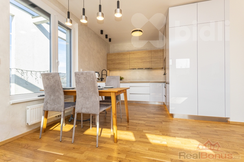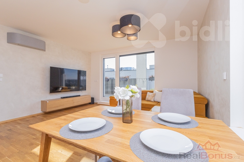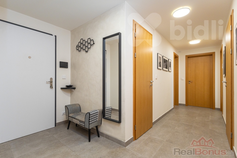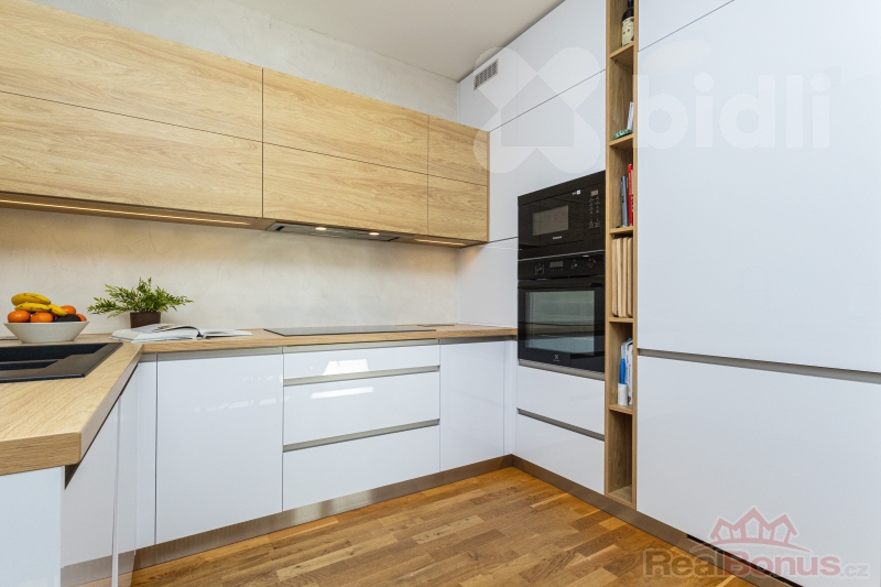 Dispozice je praktická a vhodná jak pro rodinné bydlení, tak i jako investice k pronájmu. Obývací část je propojena s jídelním prostorem a navazuje na terasu, což vytváří příjemné zázemí pro každodenní život. Kuchyně od studia Sykora pořizovací cena 500.000,- Kč s nadstandardními prvky jako je vestavěná lednice s mrazákem šíře 70 cm, stejně tak širší indukční varná deska, filtr na vodu, integrovaná skříňka na kávovar, designové podsvícení soklu, ložnice i další pokoj nabízejí dostatek soukromí. Byt disponuje koupelnou s vanou a samostatnou toaletou. Další koupelna se sprchovým koutem a WC je propojena přímo s ložnicí.