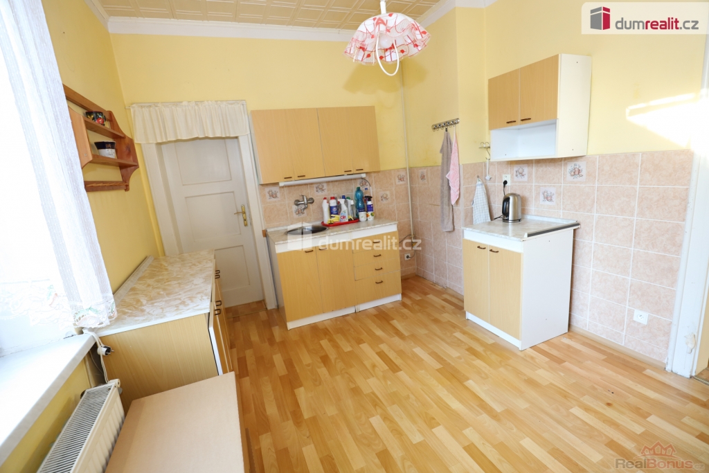 , Dumrealit.cz Vám zprostředkuje koupi krásného slunného bytu 3+1 v prvním patře cihlové vily se zahradou a se třemi sklepy v klidné ulici v Aši. Bytová jednotka o celkové rozloze 122 m (z čehož 35 m tvoří tři sklepy) je dispozičně dobře řešena, z prostorné chodby je přístupná kuchyně s jídelním koutem, ložnice, dále obývací pokoj. Z obýváku se jde dále do dalšího pokoje. Koupelna je prostorná, již byl demontován sprchový kout, jednotku čeká částečná rekonstrukce, nicméně je v dobrém udržované stavu. Dominantou bytu jsou původní dveře s obložkami. Okna jsou již plastová, jsou zde nová topná tělesa, rozvody topení jsou již v mědi. Elektroinstalace je také v mědi, v bytě je příprava na krbová kamna. U kuchyně je praktická špajzka. Vytápění a ohřev teplé vody zajišťuje kondenzační plynový kotel. Přízemí budovy bylo v minulosti odkopáno, opatřeno hydroizolační fólií, byly provedeny injektáže. K bytu náleží tři prostorné sklepy a možnost užívat další společné prostory. Budovu obklopuje pozemek o rozloze 1169 m, zastavěnou plochu domu tvoří cca 135 m, zahrada má tedy celkem 1034 m. V rámci sousedských vztahů je domluveno, že předmětný byt užívá pravou polovinu zahrady. Před domem je bezproblémové parkování. K bytu je možné dokoupit garáž. V Aši je veškerá občanská vybavenost, jsou zde škola, školka, městský úřad, supermarkety, obchody, restaurace, travel-free shop, MHD, nádraží atd.. Město je v blízkosti Německa, kde je dobré pracovní uplatnění a možnost výhodných nákupů. Cena zahrnuje provizi RK a veškerý právní servis. Byt je prost jakýchkoli věcných břemen či nároků třetích stran. V případě zájmu Vám rádi zajistíme financování skrze naše prověřené hypoteční poradce. Ev. číslo: 654850. Energetický štítek: G (20 kWh/m2/rok).