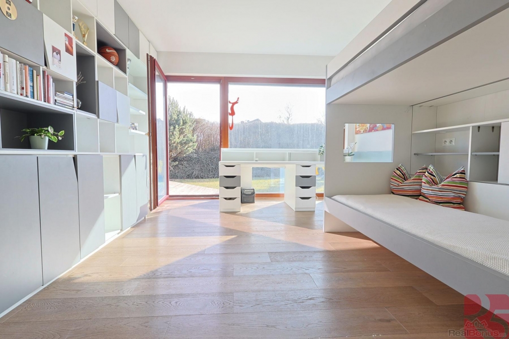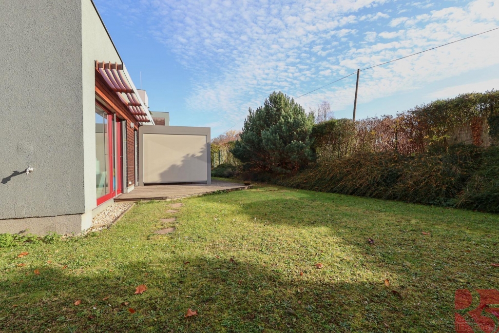 K dispozici jsou tři pokoje, velká koupelna s vanou i sprchou, finská sauna, technická místnost a komora, prostorný sklep a dvě garážová stání v suterénu domu. Pro uložení zahradních věcí poslouží zahradní domek.