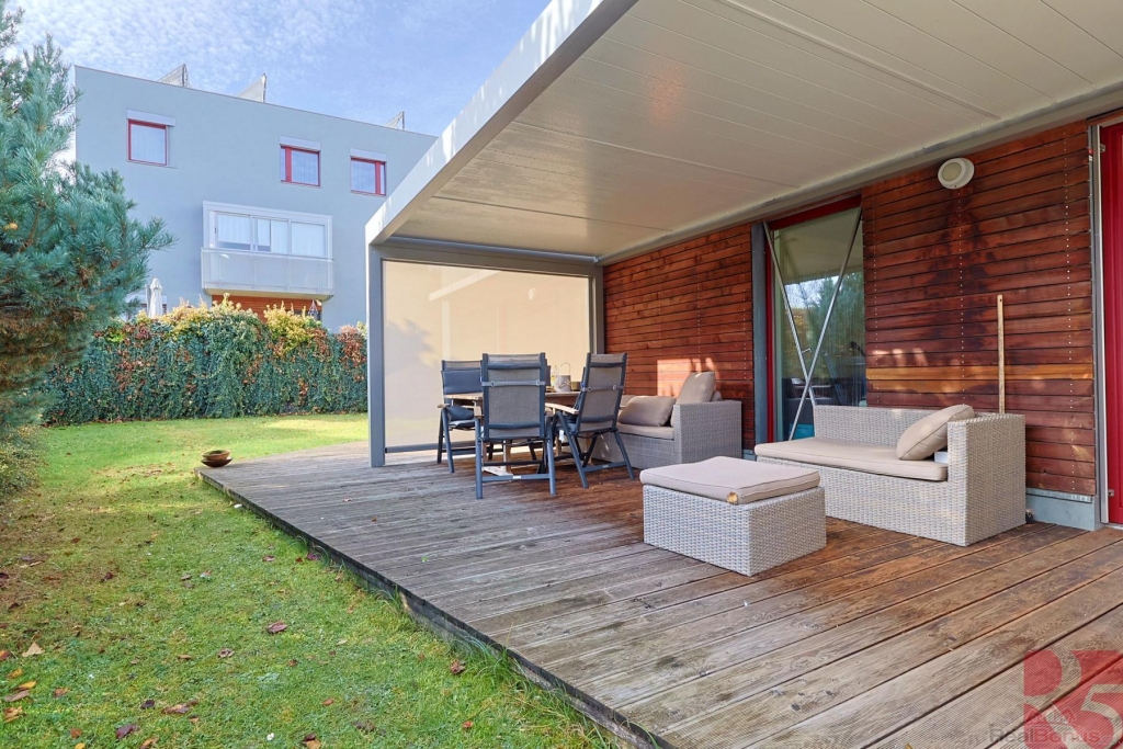 Dominantou bytu je prostorný obývací pokoj (přes 40m2) s přímým vstupem na velkou dřevěnou terasu z exotického dřeva (massaranduba), v létě zastíněná hliníkovou bioklimatickou pergolou. Na terasu je vstup i z ložnice a dětského pokoje. Okna bytu na jihovýchod.