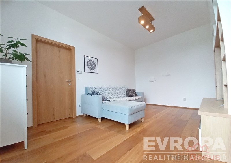 V obytných místnostech je položena kvalitní dřevěná podlaha, v chodbě praktická dlažba. Významným benefitem je také vestavěný nábytek skříně v chodbě i ložnici a obývací stěna, který zůstává součástí bytu.